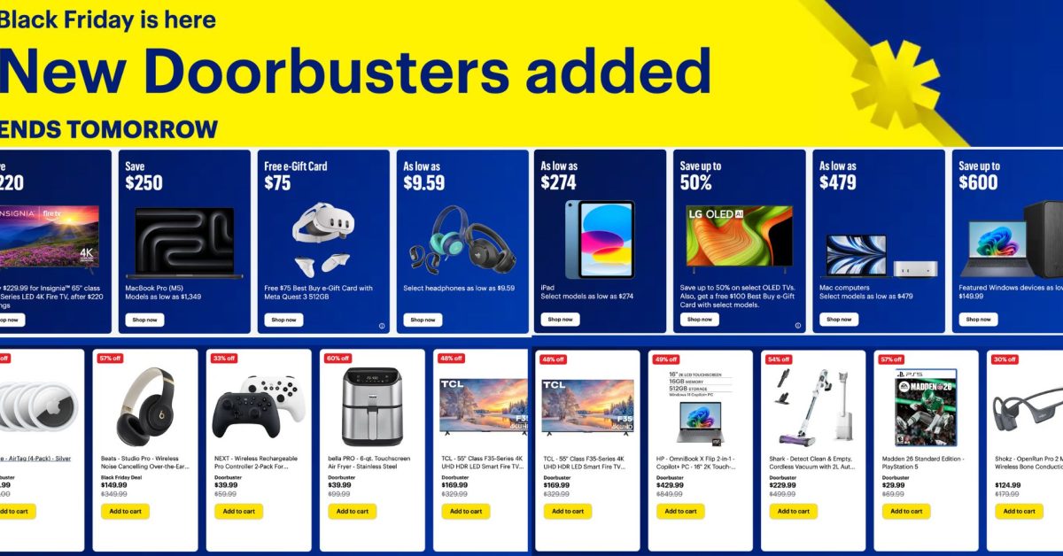 Best Buy has been rolling out early Black Friday deals for weeks, and it all builds up to today – the official Black Friday. The retailer is now offering some of the year’s lowest prices across nearly its entire catalog, and pretty much everything from Apple, gaming gear, TVs, toys, and more is seeing deep discounts. From best price ever on a M5 MacBook Pro config to new doorbusters on gaming gear, Smart TVs, and so on, all the updated deals are now live alongside its Deals of the Day deals to deliver additional discounts that run through tomorrow, when it’ll likely shift into its Cyber Monday sale. Here’s a closer look at what’s new.