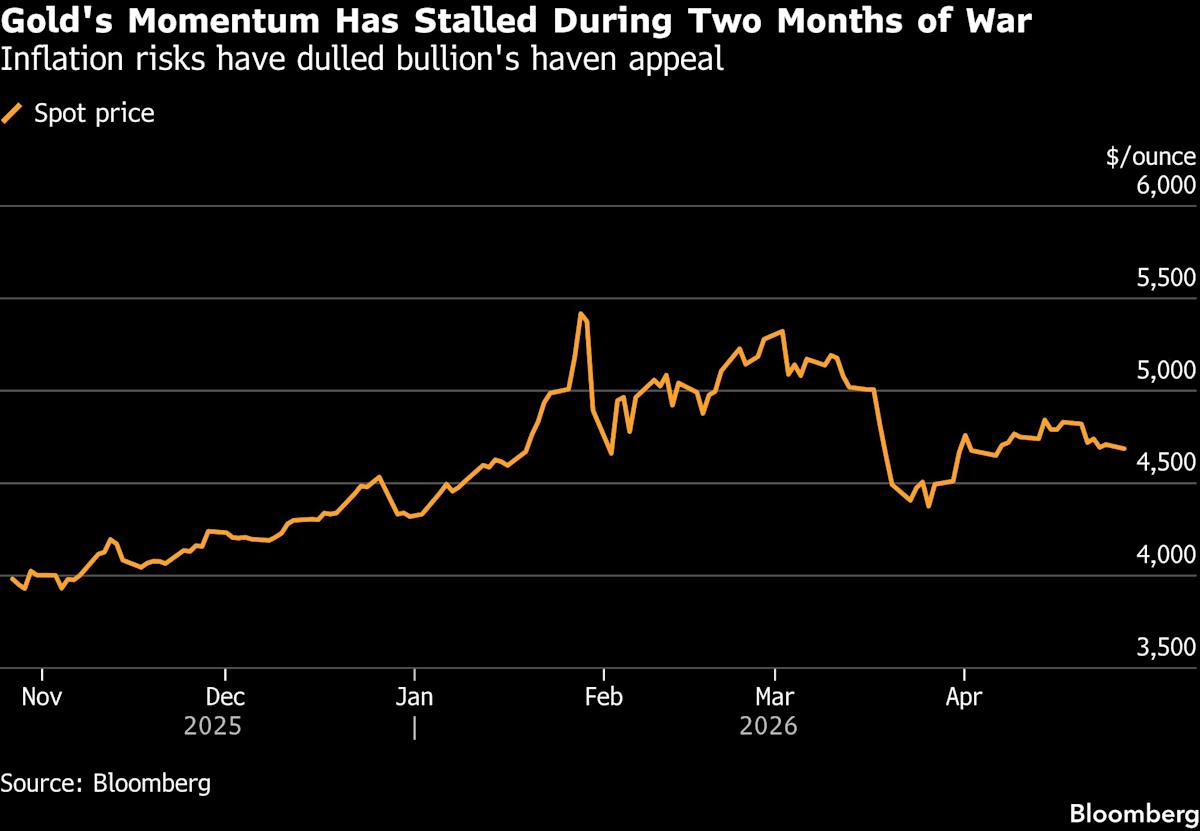 (Bloomberg) — Gold fell as efforts to resume peace talks between the US and Iran remained at an impasse, two months into a war that’s upended global markets and raised inflation risks.