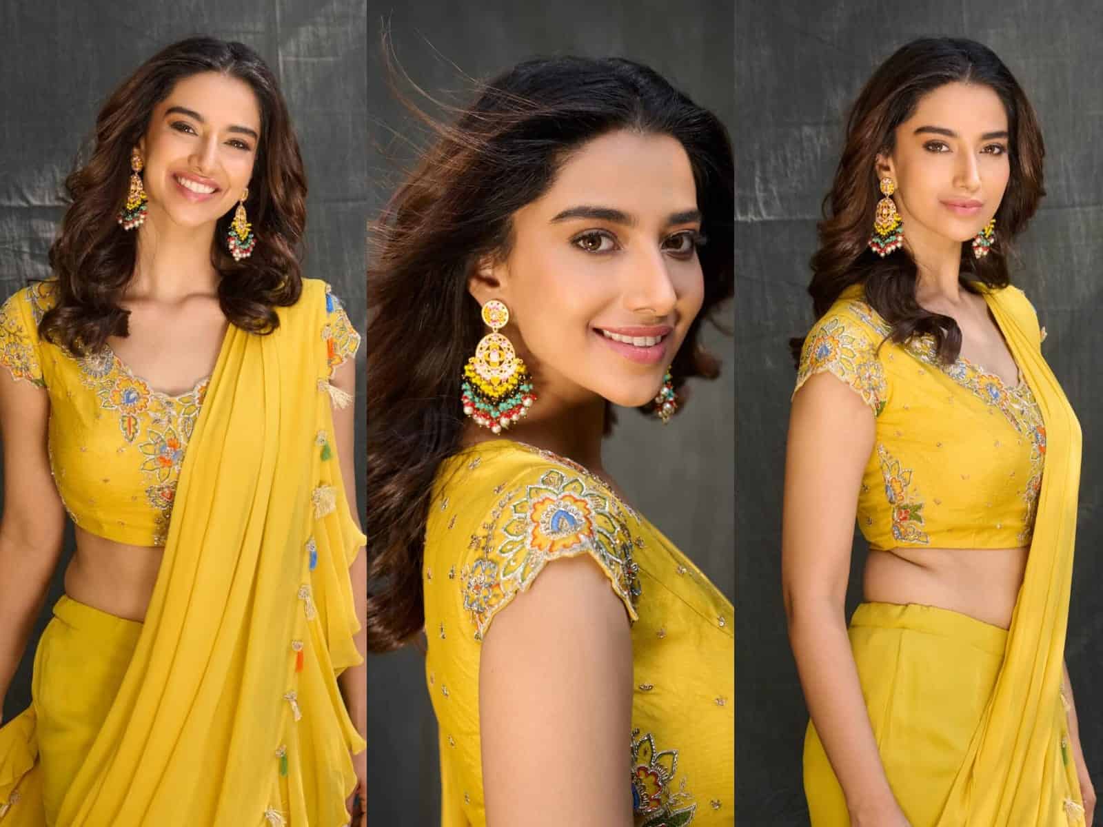 The new photos from the venue look simple but really pleasant. Meenakshi is standing in an outdoor setup with a plain backdrop, and somehow the contrast makes her outfit pop even more. The yellow sari with those soft ruffles gives a nice, easy charm, and the embroidered blouse adds a small sparkle without trying too hard. The garden around her brings in a warm, natural feel, and her relaxed expression makes the pictures feel less posed, more like a quiet break between work.