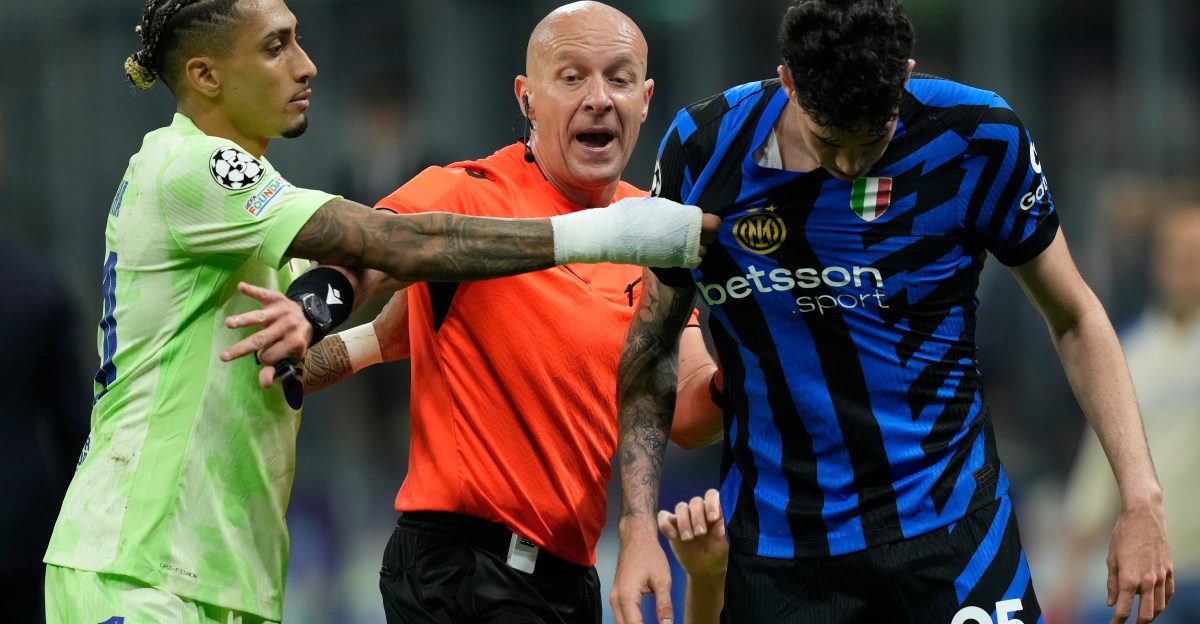 Raphinha right winger of Barcelona and Brazil, referee Szymon Marciniak and Alessandro Bastoni centre-back of Internazionale and Italy during the UEFA Champions League 2024/25 Semi Final Second Leg match between FC Internazionale Milano and FC Barcelona at Giuseppe Meazza Stadium on May 6, 2025 in Milan, Italy. (Photo by Jose Breton/Pics Action/NurPhoto via Getty Images)NurPhoto via Getty Images