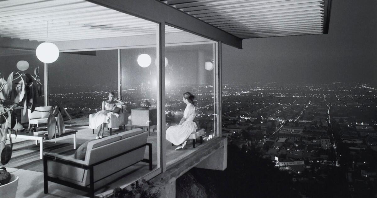 Shortly after the home’s completion, photographer Julius Shulman made a black-and-white photograph that became emblematic of the era. It shows the home at night, with two young women sitting inside in a cantilevered corner, its floor-to-ceiling windows revealing the lights of the L.A. Basin glittering in the background.
