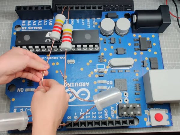At this point UncleStem had a giant Arduino UNO that was fully functional; however, one of the most useful features of these boards is the ease with which they can interface with additional hardware. Or rather, the ease with which a normal-sized UNO can interface with additional hardware. So, to demonstrate the board in action, UncleStem had to create some giant LEDs and resistors using similar techniques, in which standard components were hidden inside super-sized 3D prints.