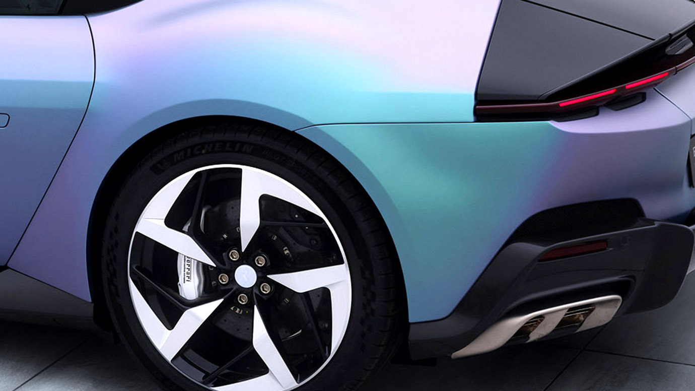 This custom color draws on Korean tradition and features a matte texture that shifts subtly between green, violet, and blue. Artist Dahye Jeong also created unique Scuderia Ferrari shields, wheel caps, and badges with a translucent finish, adding an extra layer of depth to the bodywork.