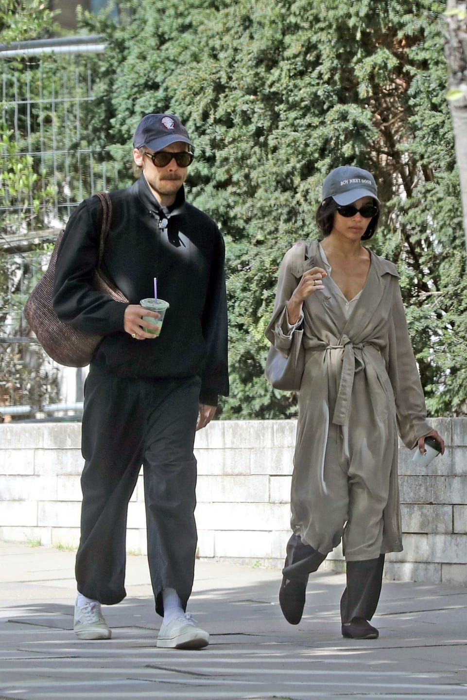 On their most recent outing, the couple showed off some of their signature couple’s dressing, wearing coordinating caps and slouchy monochromatic looks. Kravitz, an early adopter of “quiet luxury” always favoring easy, sleek layering moments, slipped into a slouchy light-weight trench. Left unbuttoned but tied at the waist with a belt, the light-grey coat gave a low V-neck silhouette, mirrored by the neckline of a loose white button-down shirt underneath. Equally as relaxed and light-weight were her trousers, fashioned in a darker shade of gray.